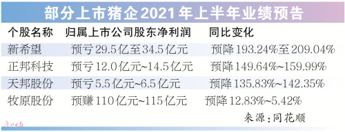 数据显示,2021年上半年,新希望预计归属于上市公司股东的净利润亏损29.5亿至34.5亿元,同比下降193.24%至209.04%;每股收益亏损0.67元~0.87元,上年同期为盈利0.76元。