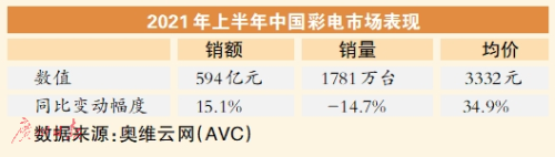 但值得注意的是,今年上半年彩电市场的表现不容乐观。奥维云网报告指出,2021年上半年,中国彩电市场销额594亿元,同比增长15.1%,均价3332元,同比增长34.9%。彩电零售均价涨幅一度接近50%。价格的上涨,直接导致彩电市场销量自3月起,连续4个月出现11%-34%的大幅度下滑,上半年累计销量1781万台,同比下降14.7%。(文、表/广州日报全媒体记者许晓芳)